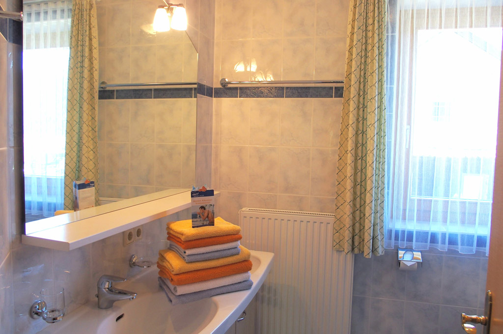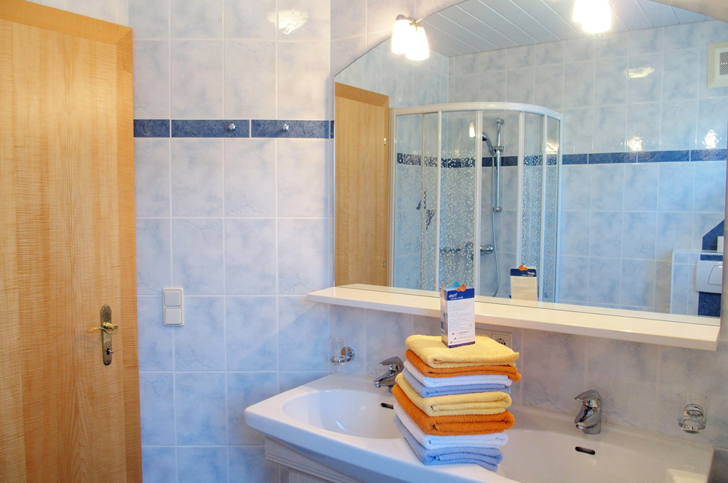 - Bad mit Doppelwaschtisch, Dusche und WC, sowie Haarfön