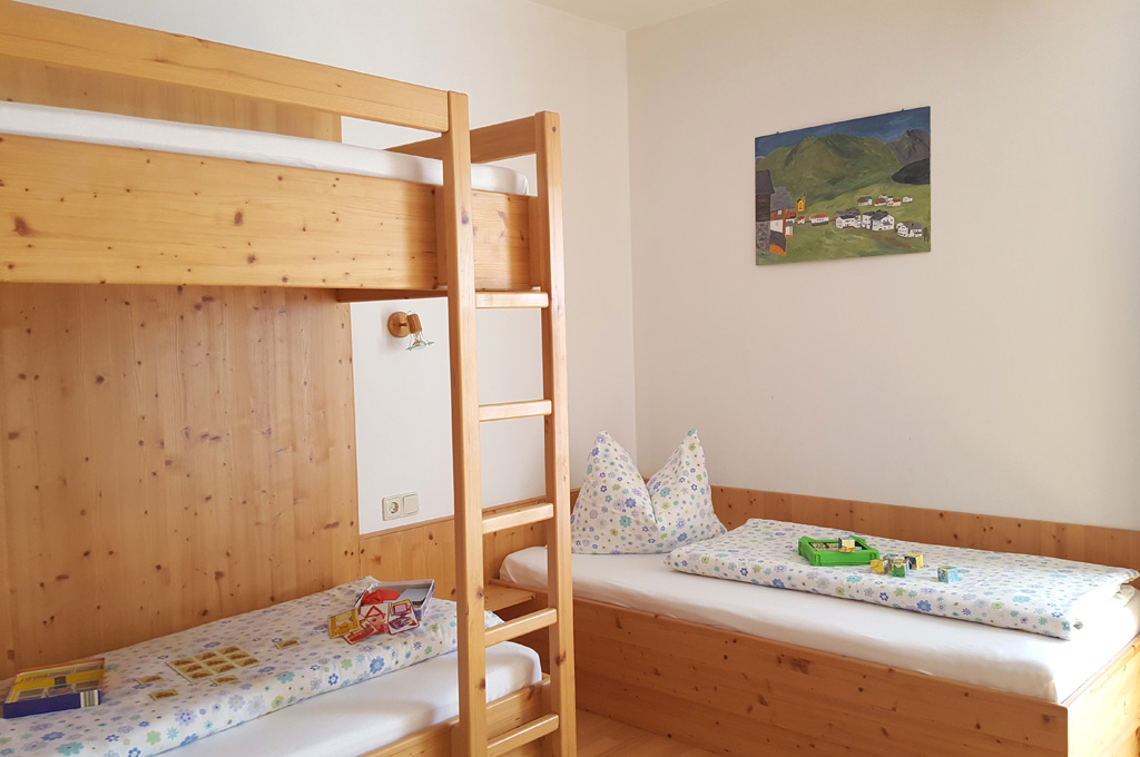 - Ein großes 3-Bett Zimmer mit 1 Hochbett und 2 Einzelbetten, Fliegengitter, Verdunkelungsrollo und Westbalkon (weiteres Zustellbett möglich)