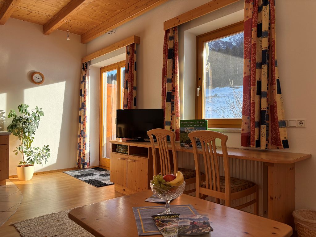 Genießen Sie einen herrlichen Ausblick von unserer Ferienwohnung "Adlerhorst" (mit Südbalkon) sowohl auf die heimische Bergwelt, als auch auf die weite Landschaft des Lesachtales. "Eben wie von einem Adlerhorst aus!" Auf einer Wohnfläche von 67m² finden Sie zwei Doppelbettzimmer (Bettenlänge z. T. 2,10 m), ein Wohnzimmer mit großer Eckcouch und geräumigem Schreibtisch, eine vollausgestattete Küche und ein Bad mit Badewanne sowie ein extra WC. Eine umfangreiche Kleinkind-Ausstattung (nach Absprache) steht Ihnen kostenlos zur Verfügung, ebenso auch Bad- und Küchenwäsche sowie Bett- und Tischwäsche.