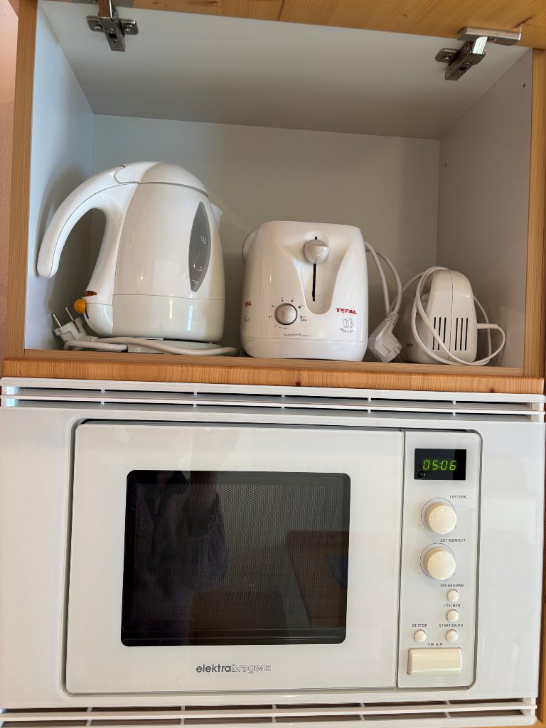 - Sehr gut ausgestatteter Küchenblock aus Massivholz, mit zahlreichen E- Geräten: Geschirrspüler, Mikrowelle, Kühlschrank mit 4 Stern - Gefrierfach, E-Herd mit Backrohr, Kaffeemaschine, Toaster, Wasserkocher, Mixer und Koch- bzw. Essgeschirr